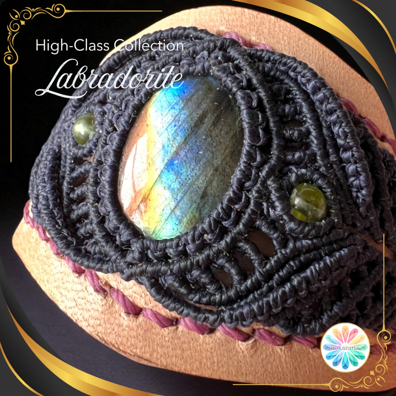 ラブラドライトをマクラメ編みで包み込み、本革レザーと組み合わせた一点物ブレスレット。