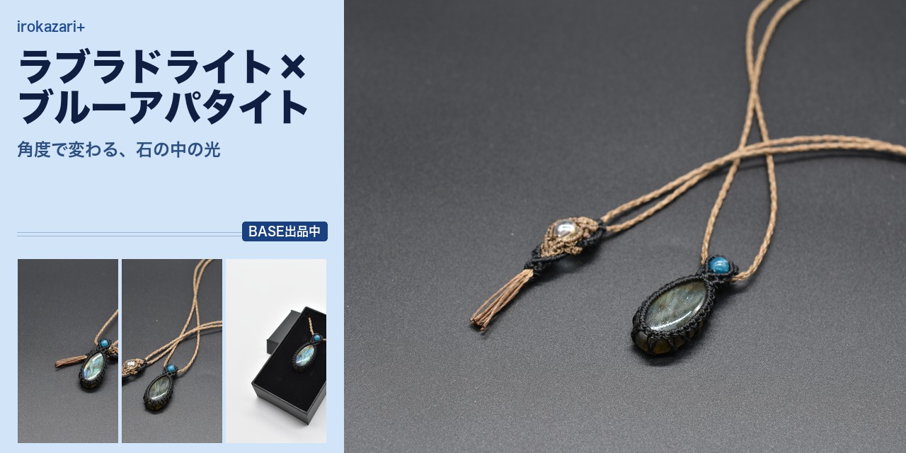 - 素材:天然石(ラブラドライト・ブルーアパタイト)・マクラメコード(黒)