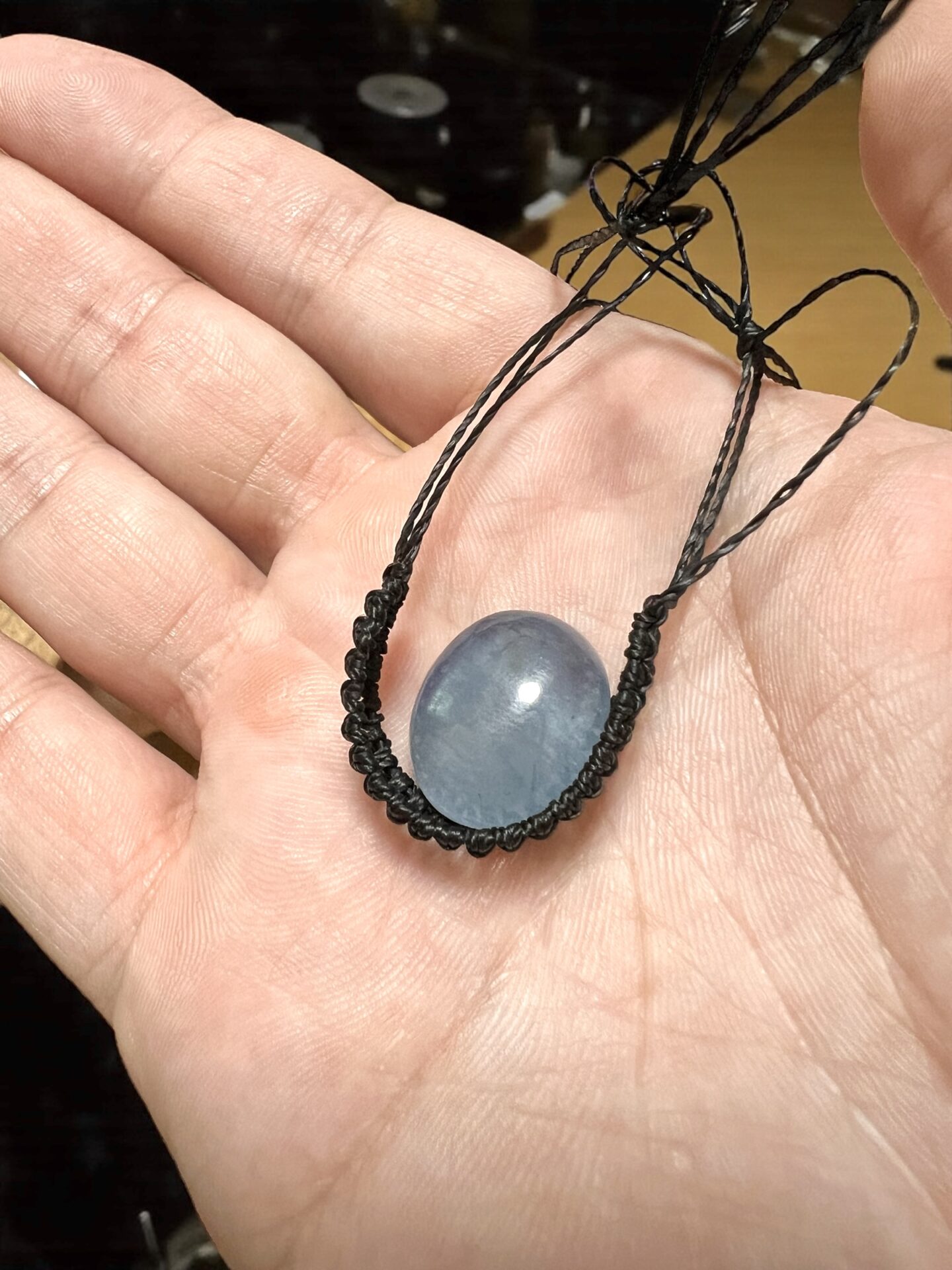 カット水晶は黒の紐とロードライトガーネットで引き締め、